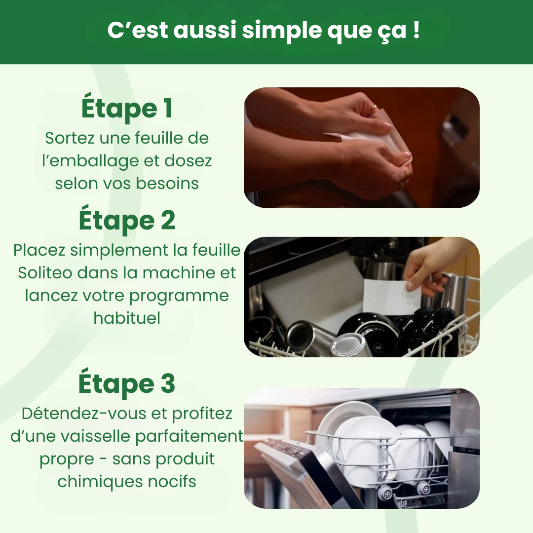 Grâce à leurs enzymes puissants, les feuilles lave-vaisselle Soliteo décomposent efficacement les graisses et les résidus alimentaires. Résultat : une vaisselle étincelante sans effort, même à basse température.